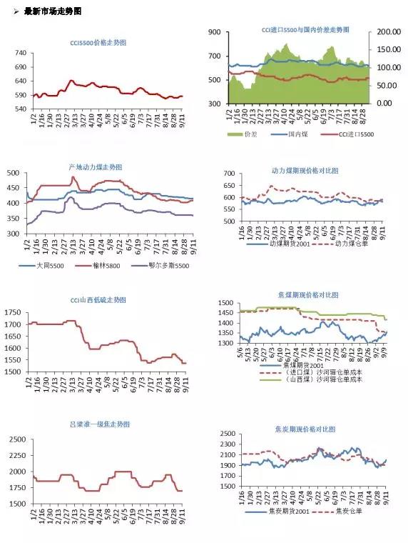 部分焦企提涨焦炭出厂价100元/吨,上下游目前多观望市场。焦企方仍保持积极出货,厂内焦炭库存尽量维持低位或无库存状态,而钢企方面目前到货保持平稳,暂未出现补库或减量的情况。市场预期看涨看跌均有,整体看,看涨者居多。截至9月17日,汾渭吕梁准一级焦1700元/吨,日环比持平;唐山准一级焦1910元/吨,日环比持平;日照港准一级焦1870元/吨,日环比持平。
